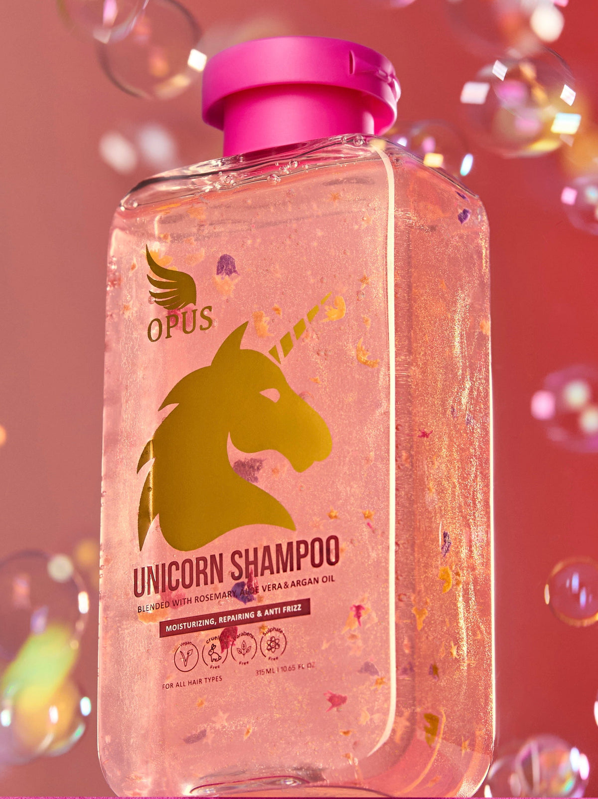 The world's first Unicorn Shampoo with Washable and Dissolvable 3D Unicorns, Stars & Glitter. Blended with Rosemary, Aloe Vera and Argan Oil